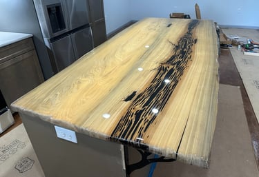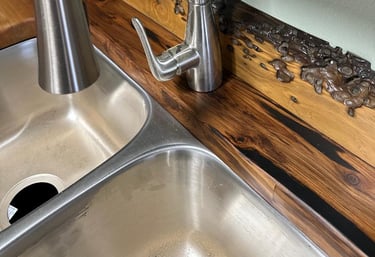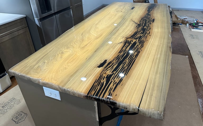 Seen here in the picture to the left, the Pecky Cypress has been filled with black epoxy, and then the counter finished with tabletop epoxy for a kitchen island.