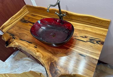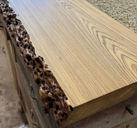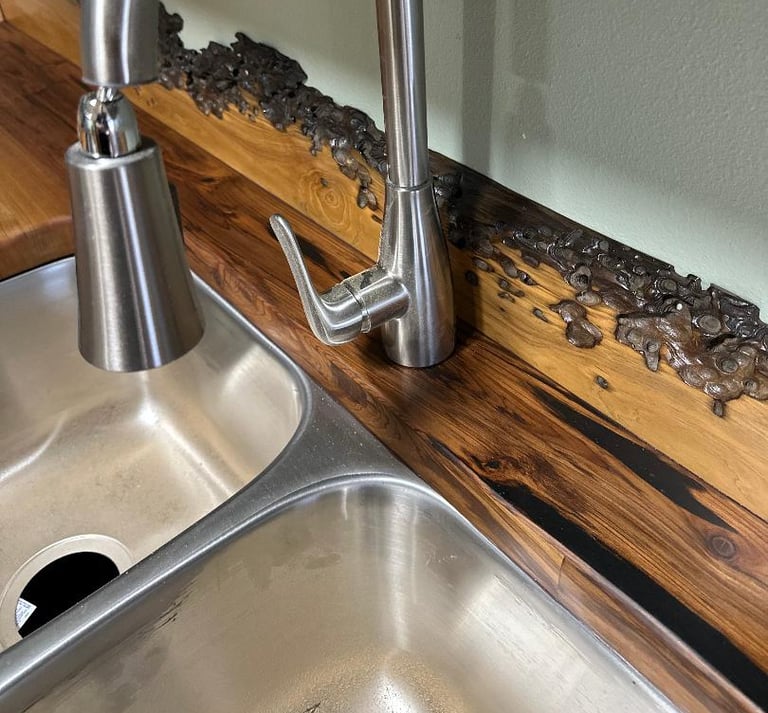 Another feature, as seen in the pictures below, is the live edge of slabs used as the edges of tables, counters and shelves. These distinct edges speak to the time spent submerged, and the effects of slow flowing water and marine life. Most of all, these edges call out with character that attracts the eye and delights the soul.